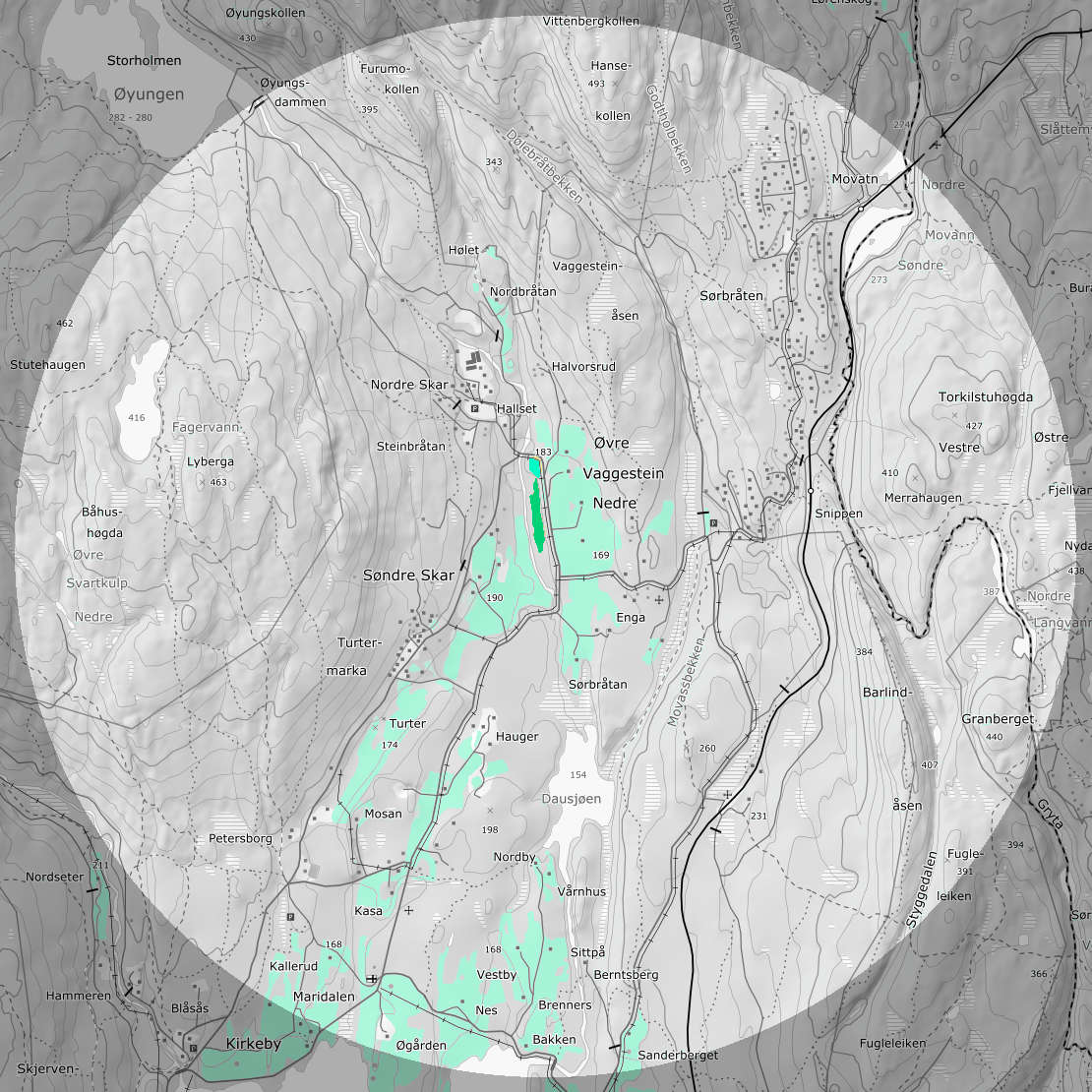“Langjordet” er navnet på et jorde tilhørende gården Øvre Vaggestein, nord i Maridalen. Kartet viser nordre del av Maridalen med dyrka mark markert grønt, og Langjordet i dypgrønt. Sirkelen som er markert representerer hvor langt bier flyr fra kuben, ca 3 km.